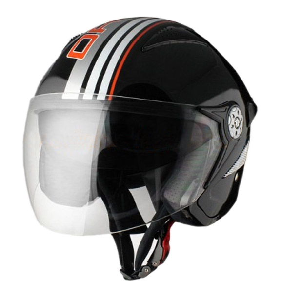 Шлем Origine Falco Brera (Ориджн Фалко Брера) в черно-оранжевой расцветке. Основной цвет - чёрный с оранжевым логотипом фирмы. Оригинальный открытый шлем с надёжным прозрачным стеклом и штатными солнцезащитными очками.